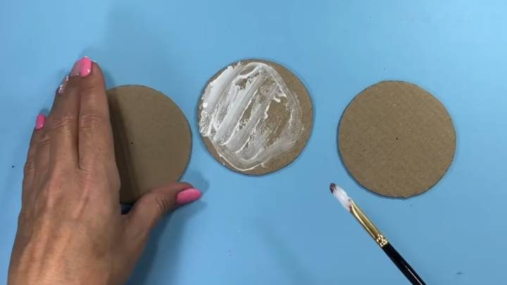 Когда холодный фарфор из муки, клея и геля будет готов, отщипните кусочек, смажьте руки любым жирным кремом, раскатайте тесто в длинную колбаску. Приклейте на ПВА вокруг трёх кругов из картона.