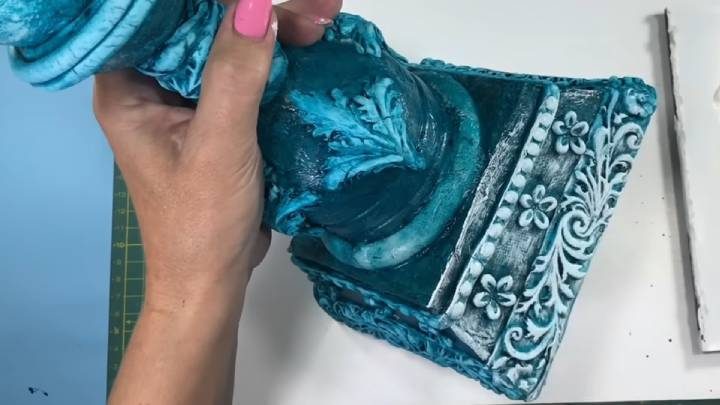 Добавьте больше декоративных деталей, затонируйте поделку акриловой краской тёмного-синего и белого цвета.