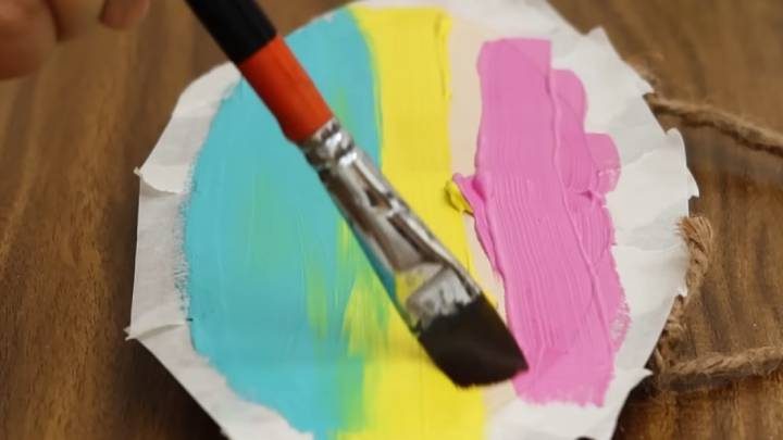 Край спила закройте малярным скотчем. Добавьте три «шарика» краски: розовый, жёлтый, голубой. Жёлтый займёт меньше всего места, а розовый и голубой — большую часть спила. На местах стыков краски смешивайте её, чтобы был плавный переход цветов.