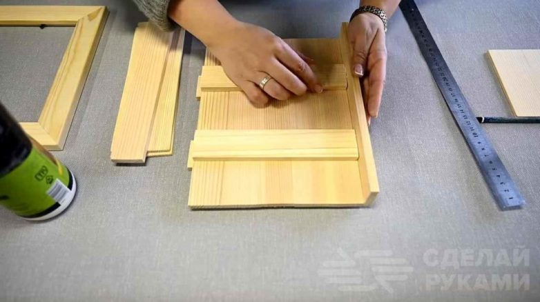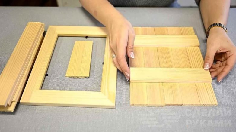 Первым делом необходимо напилить деревянные рейки по размеру (по высоте фоторамки). Их нужно напилить такое количество, чтобы сложить из них потом заднюю и боковые стенки. Заднюю стенку ключницы также можно сделать из куска фанеры.