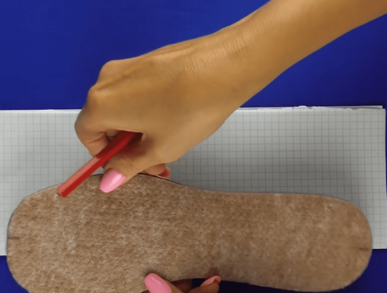 Для выкройки используем стельку подходящего размера. Ее не нужно будет даже обводить. Сгибаем лист пополам и прикладываем стельку вдоль линии сгиба таким образом, чтобы она оказалась на бумаге наполовину. Отмечаем ширину стопы и длину стельки, а затем формируем овал и вырезаем его.