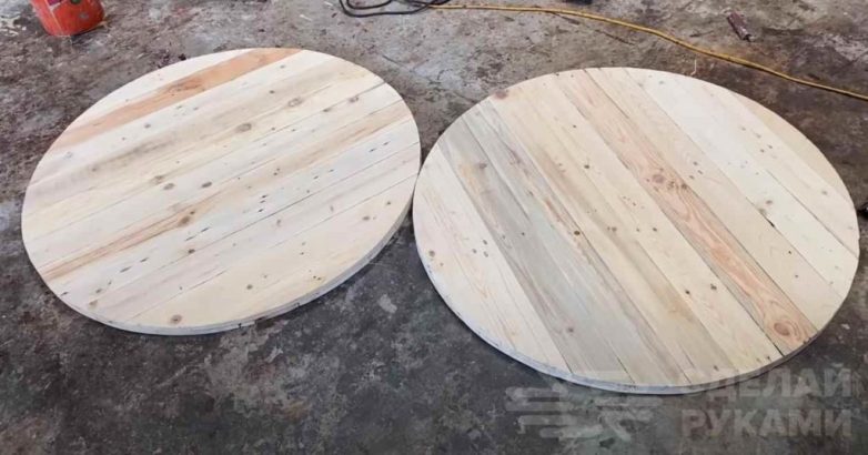 Аналогично поступаем со следующей партией досок. В результате у нас получатся два одинаковых круга. Это и будут боковые части будущего шезлонга.
