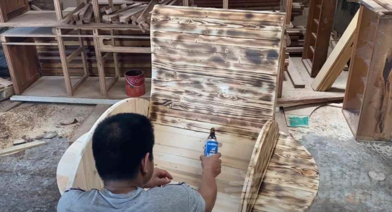 Чтобы наш импровизированный трон смотрелся более оригинально, обжигаем его с помощью газовой горелки. И в завершении покрываем древесину акриловым лаком.
