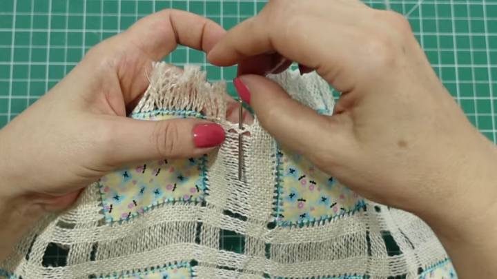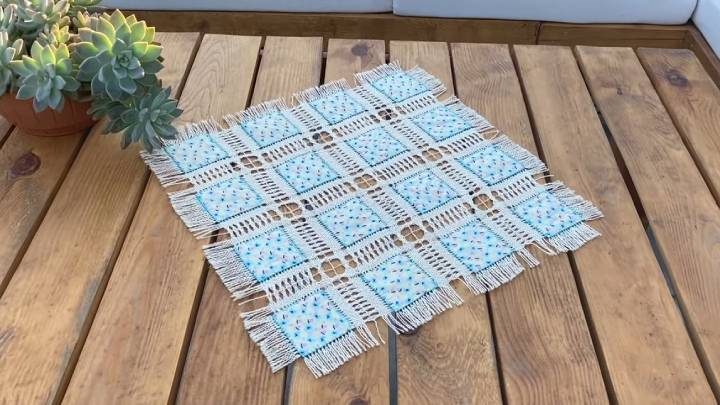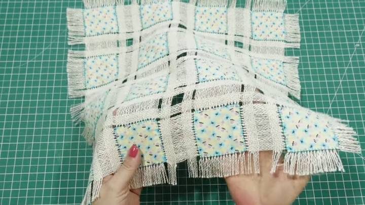 Вот что получается. Далее, по всей окружности ткани вытяните нити, чтобы сделать бахрому. Также выдерните больше нитей между квадратами.