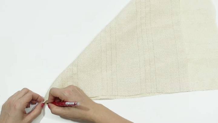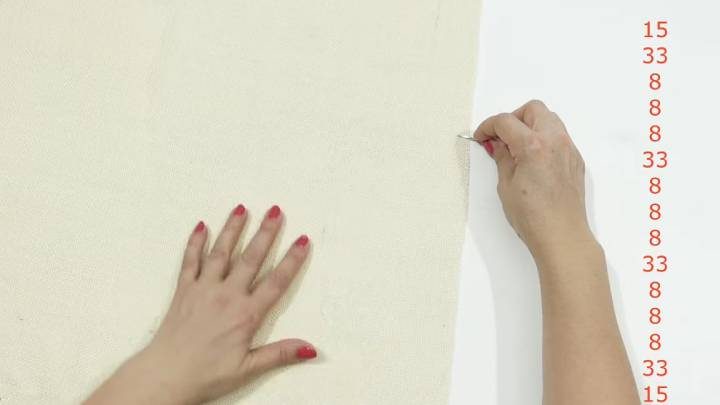 С краю ткани (можно взять обычную джутовую) посчитайте нити и выдёргивайте, согласно схеме выше. Как вы видите, начало и конец «зеркалят» друг друга, а расстояние по центру — одинаковое, повторяющееся. Когда сделаете достаточную высоту своего изделия, сложите наискось тругольником, чтобы получить квадратную форму.