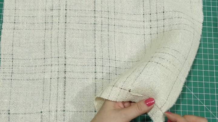 И прошейте вручную интересным узором. В узоре участвует 4 нити. Отсчитайте от верха 4 нити, за нижние 2 нити заведите иглу, затем — поверх верхних двух, вытяните по центру. Получается, четыре нити (по две) перекрестились.