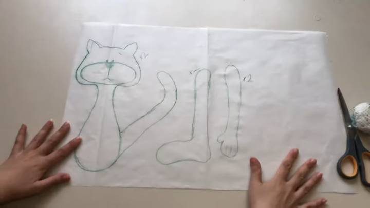Схематично нарисуйте тело с головой и лапки котика. Если не получается нарисовать от руки, то просто приложите лист бумаги к экрану комьютера/ноутбука/планшета и перерисуйте по линиям (в интернете можно найти много разных схем).
