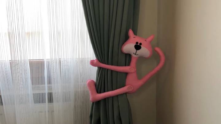 Эта идея шьётся легко, причём без машинки, а получается просто замечательно! Сшейте милого котика, который будет выполнять функцию подхвата для штор! Прекрасная идея для комнаты ребёнка.
