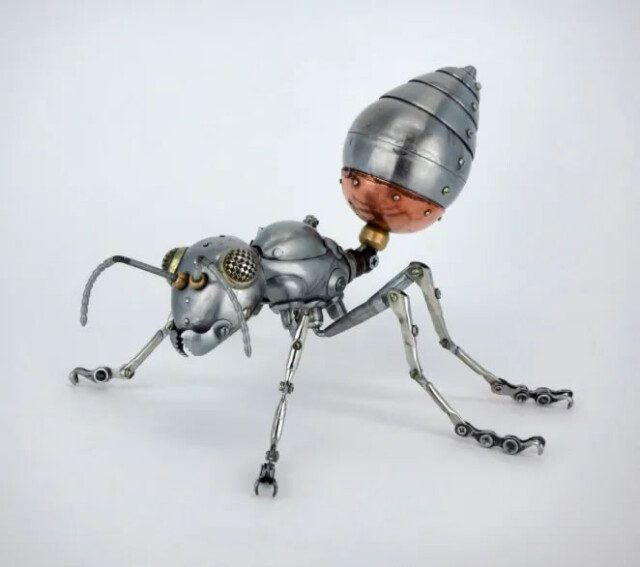 Российский художник Игорь Верный создает скульптуры животных и насекомых в стиле стимпанк. Для создания своих творений он использует металлолом, старые велосипедные цепи и столовое серебро.