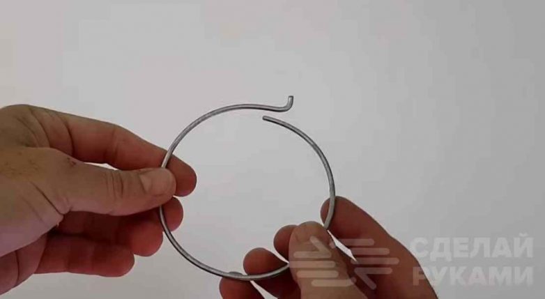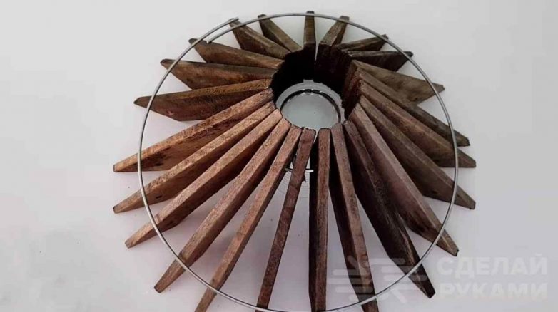 На следующем этапе из стальной проволоки делаем маленькое кольцо. Нанизываем на него наши заготовки. Далее необходимо сделать еще одно кольцо, но уже большего размера.