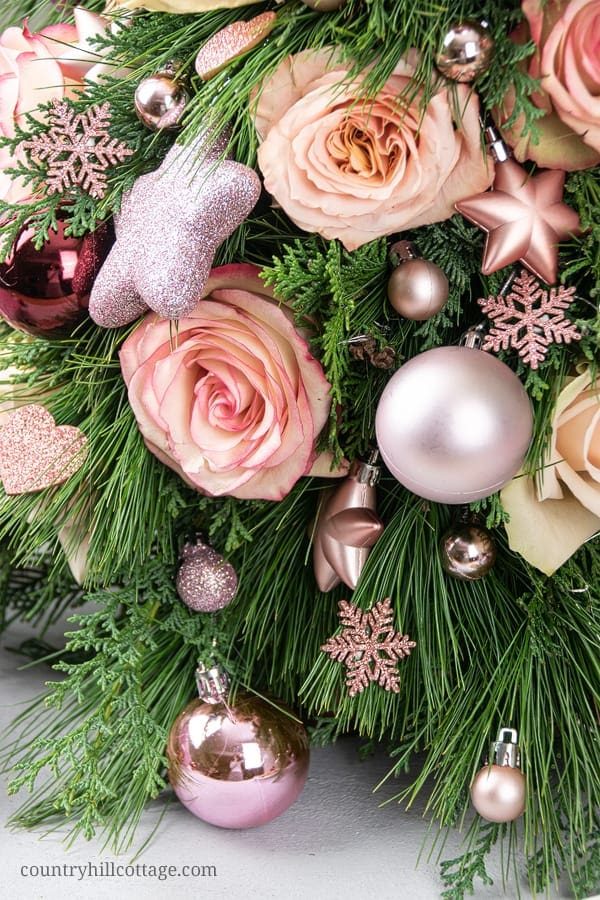 Следующий шаг — украсить нашу мини-праздничную елку более крупными украшениями, равномерно распределив их вокруг елки. Цель здесь состоит в том, чтобы заполнить любые пустые места между розами и создать гармоничную композицию.