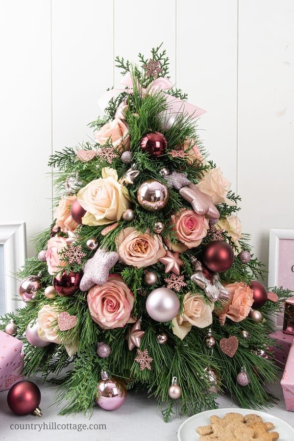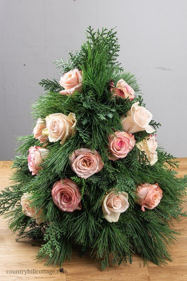 Поскольку елка построена из цветочной пены, вы можете использовать свежие цветы, чтобы украсить центральную часть мини-елки. Живые цветы — отличный способ создать действительно уникальную новогоднюю елку. Лучше всего использовать цветы с крепким стеблем, так как стебель нужно втыкать в флористическую пену. Вырежьте цветы под прямым углом и вставьте их в пенопласт. Помимо роз, вы также можете использовать лилии, гвоздики или хризантемы. Эти цветы относительно долговечны и должны оставаться свежими в течение как минимум недели, если конечно они свежесрезанные. Также можно использовать искусственные цветы.