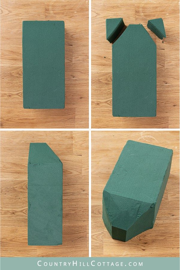 Сначала нам нужно обрезать 2 кусочка флористической пены. Отрежьте 3 треугольника на одном конце цветочной пены, чтобы сформировать кончик, как вы можете видеть на картинках. Затем замочите цветочную пену в большом количестве воды минимум на 30 минут.