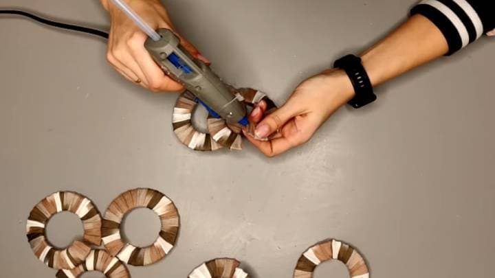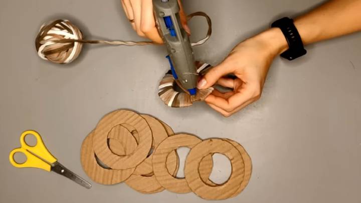Надрежьте с одной стороны, чтобы разомкнуть кольцо. Оберните каждое кольцо пряжей, зафиксируйте горячим клеем.