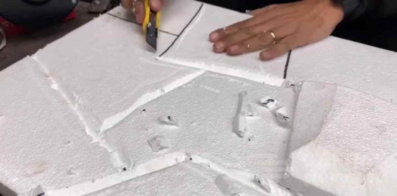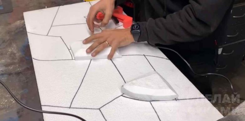 Из другого куска пенопласта автор вырезает несколько элементов и придает им необходимую форму (по форме уже нарисованных камней). Затем ножом нужно сделать скосы в верхней части.
