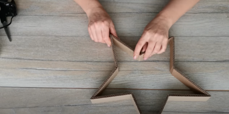 Все довольно просто: для создания каркаса каждой из звезд вам потребуется 10 полосок из гофрокартона или иного подходящего материала. В нашем случае размеры заготовок: 32 см на 4 см, 24 см на 4 см и 16 см на 4 см. Далее заготовки для одной из звезд сгибаем пополам.