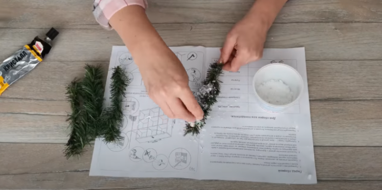 А также искусственные елочные ветки, дополнительно задекорированные искусственным снегом.
