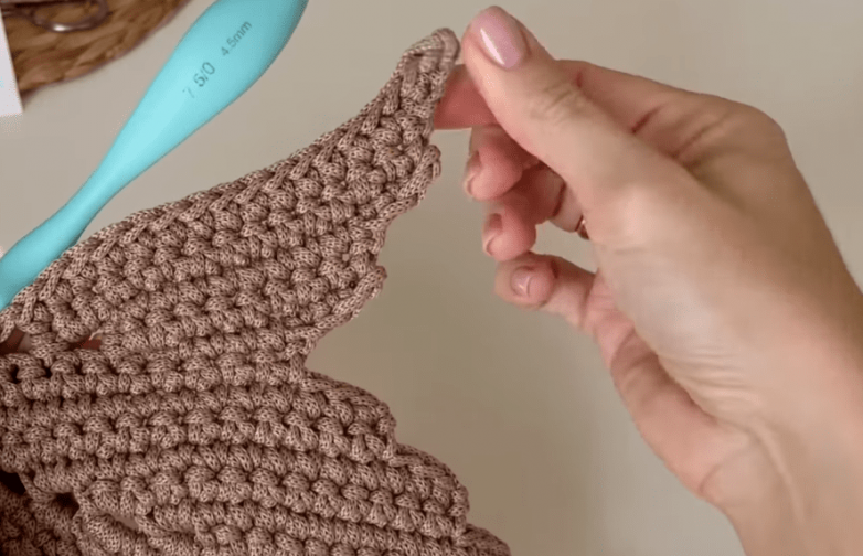 Для формирования боковой части листа продолжаем вязать СБН по ходу работы. Так как и раньше останавливаемся за 3 петли до конца ряда. Дальше нужно сделать поворот и двигаться в обратном направлении. Набираем 4 ВП.