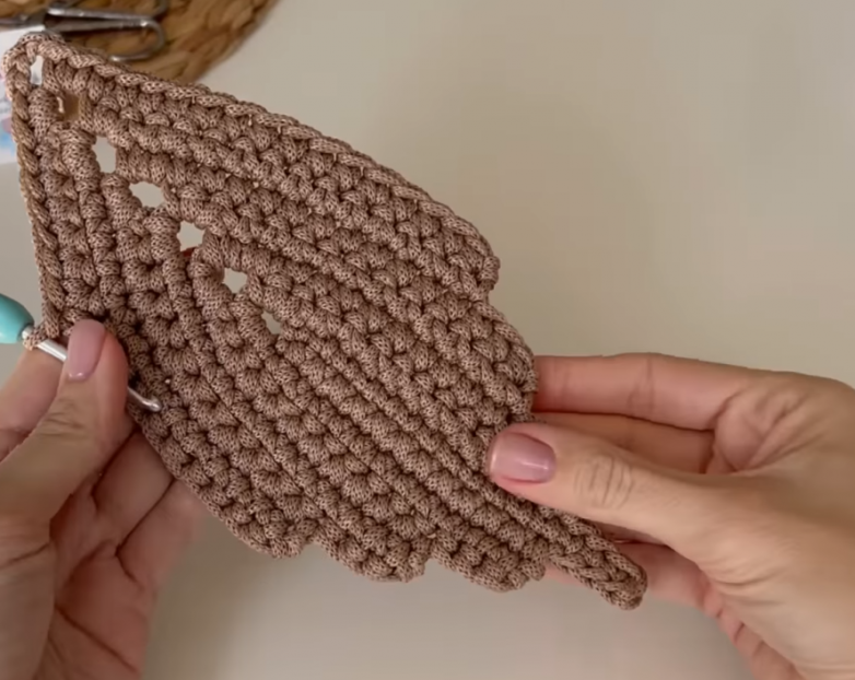Теперь, чтобы получить реалистичный кленовый лист, нужно сделать укороченные ряды. Для этого в первом из рядов не довязываем до конца ряда 4 петли, а в следующем 3. В остальном работа полностью идентична той, которая была проделана при вязании центральной части листа, разве что для окошек здесь необходимо делать всего по 2 ВП.