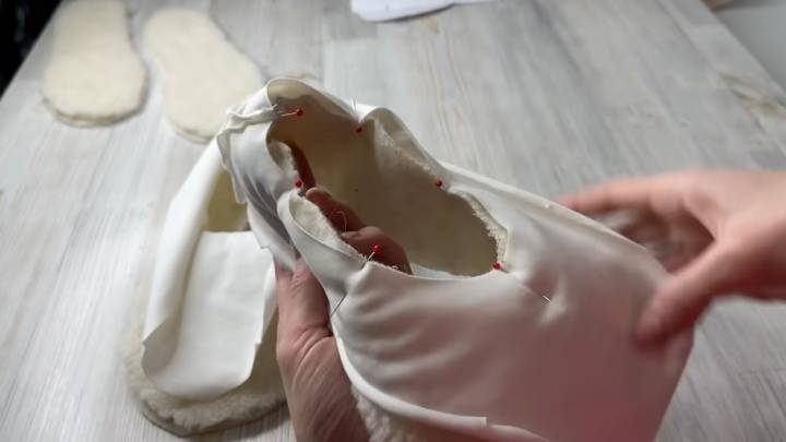 Затем соедините стельку мехом наружу (чтобы при финальном выворачивании тапочка мех был внутри). Прошейте на машинке (лучше — на оверлоке).