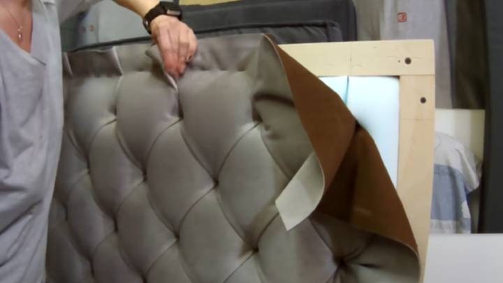 Подробнее о том, как сделать мягкое изголовье с каретной стяжкой, смотрите в видео ниже: