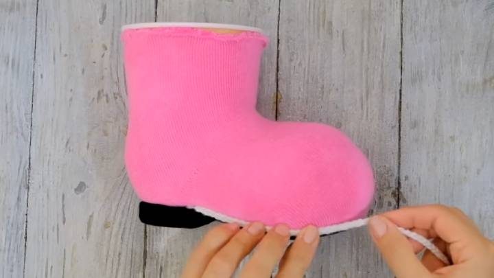 К верхней части сапожка приклейте ткань с длинным мехом.