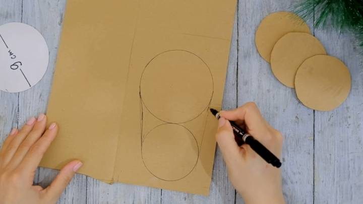 Подберите упаковку, как на фото выше. Измерьте диаметр верха и дна, перенесите на картон, соедините два круга плавными линиями сбоку, вырежьте. Это будет подошва. Вырежьте две таких детали. Также вырежьте несколько кругов по размеру дна и приклейте к нему, чтобы выровнять и укрепить.