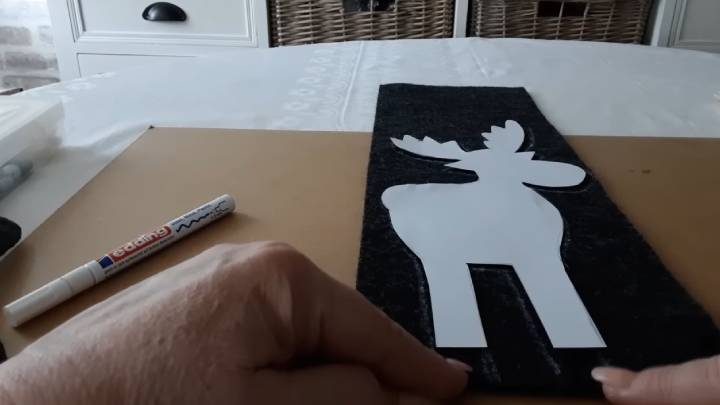Найдите в Интернете заготовки оленя, ёлки и других фигурок, которые считаете новогодними. Перенесите на бумагу, вырежьте. Теперь подготовьте фетр и деревянные палочки. Можно покрасить низ палочки акриловой краской.