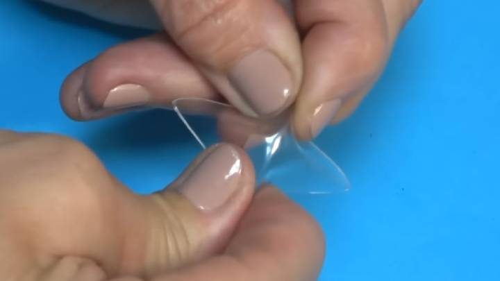 Сверните угол пластиковой полосы треугольником, отрежьте квадратик. Теперь сложите ещё раз треугольником, но уже с другой стороны. Теперь пальцами надавите на образовавшиеся грани, и получится четырёхконечная звезда.