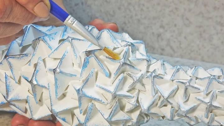Затем возьмите кисть и прокрасьте выступающие грани любым цветом. Например, красиво смотрится голубой с серебряным.