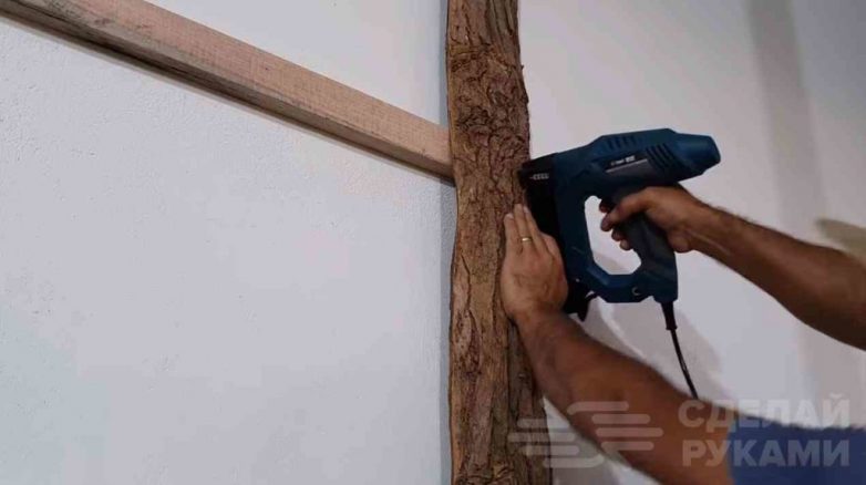 По центру фиксируем кору на саморезы, чтобы на поверхности не было «бугров». А по краям автор «пристреливает» с помощью гвоздей.