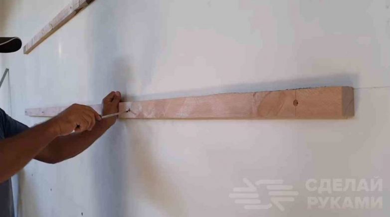На следующем этапе делаем разметку на стене, сверлим отверстия и забиваем в них дюбеля. Потом прикручиваем деревянные бруски.