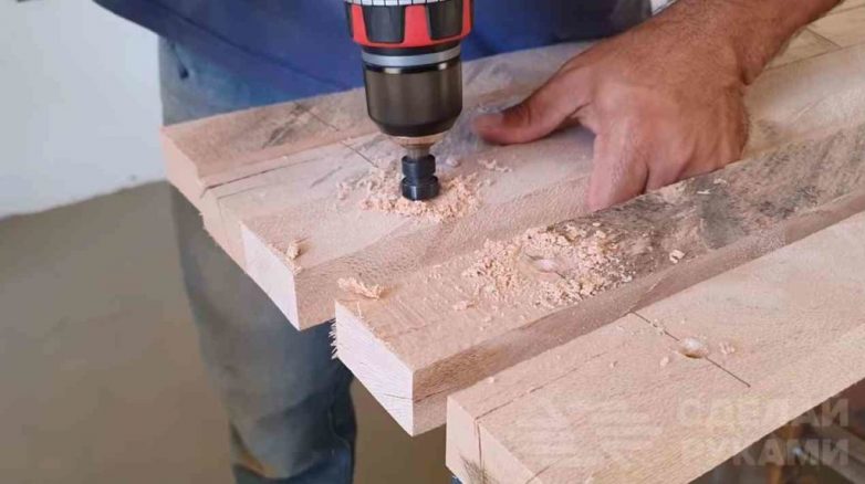 Первым делом необходимо будет отпилить деревянные бруски требуемой длины. Делаем разметку по всей длине брусков с определенным шагом и сверлим отверстия.
