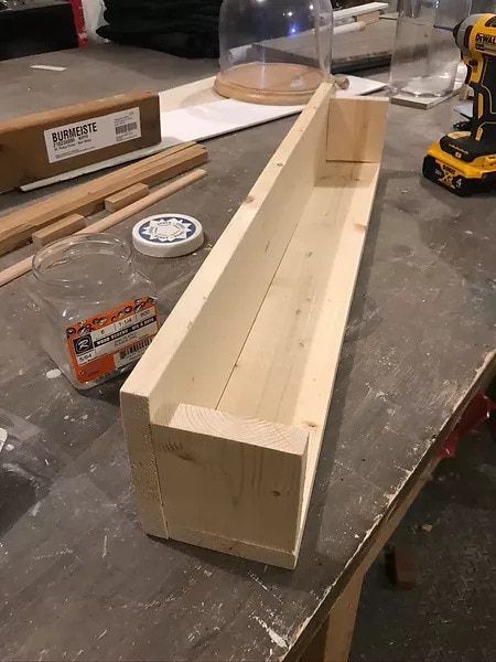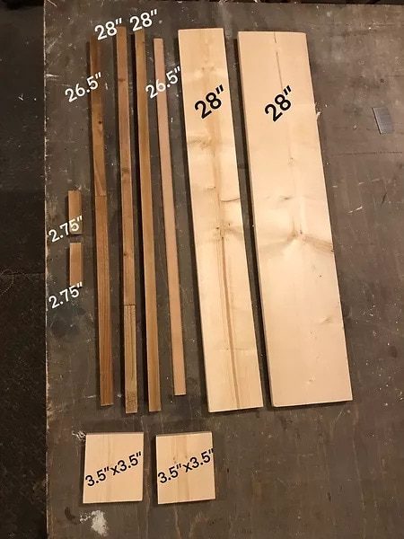 Распилите доски и подготовьте рейки необходимого размера для полки. Размеры определяйте самостоятельно. Ниже указан пример полки, в дюймах.