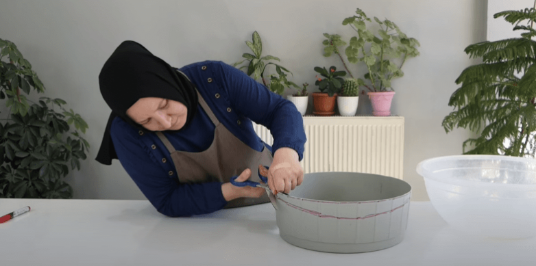 Первым делом необходимо подготовить сами тазики. Убрать острые или сколотые края, если они есть, а также предать одному из них нужную форму — вырезать вход.