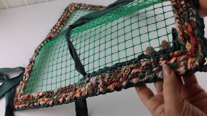Свяжите быстро и просто красивую и полезную вещь для дома. Для этого можно собрать старые простыни или какие-то остатки тканей, лоскутки — всё пойдёт в дело! Также запаситесь садовой сеткой и проволокой.
