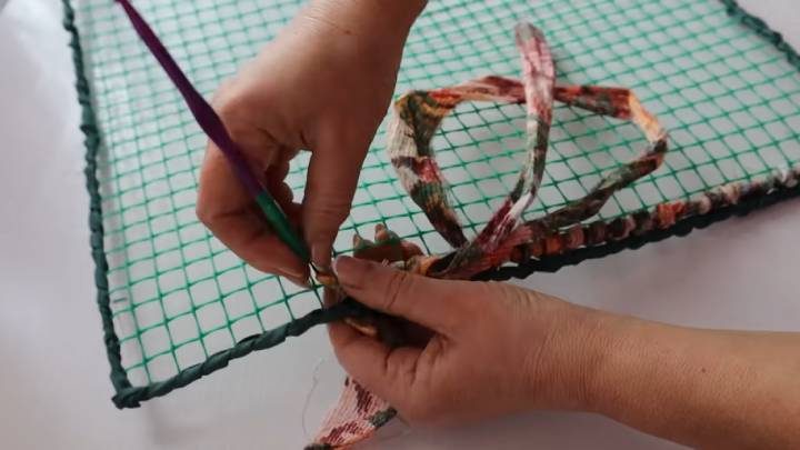 Теперь начинаем вязание. Один лоскут проденьте через петлю проволоки, второй лоскут положите снизу под сеткой. Крючком вытягивайте петли (4-5 петель за один раз), а затем протягивайте сразу через все крючок, на конце которого — проволока с лоскутом.
