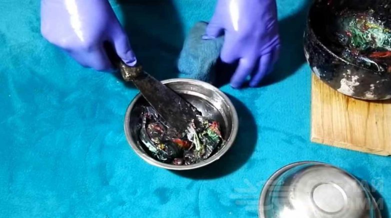 Когда крышки полностью расплавились, автор перекладывает массу в миску. Шпатель, который используется для этого, необходимо смазать маслом.