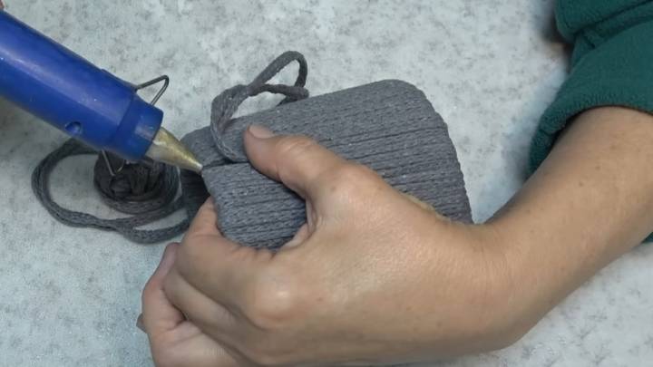 Вырежьте круг из картона чуть большего диаметра, чем отверстие в поделке, приклейте к нему цепочку воздушных петель из пряжи другого цвета. Приклейте к одной из отверстий поделки, чтобы его закрыть.