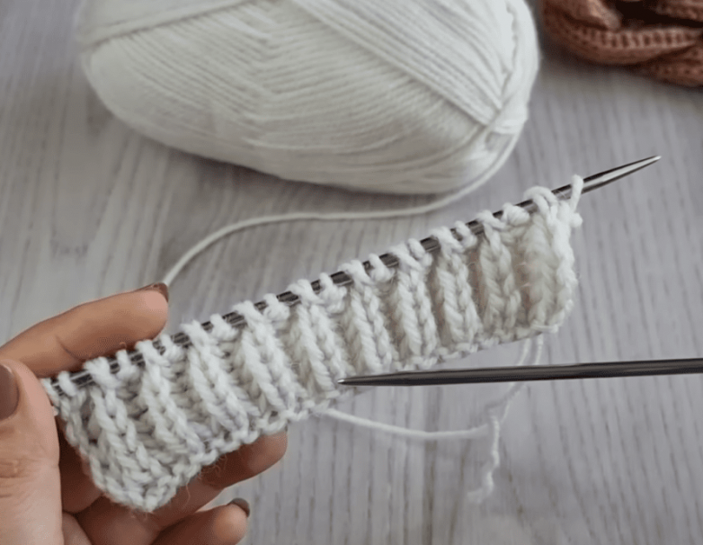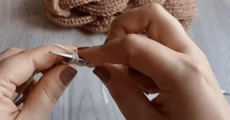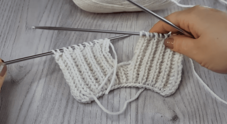 В следующем ряду переснятые непровязанными петли провязываем лицевой вместе с накидом в один прием, а те, что были провязаны снимаем вместе с накидом. Именно за счет этого резинка получается плотной, объемной и одинаково выглядит с обеих сторон.