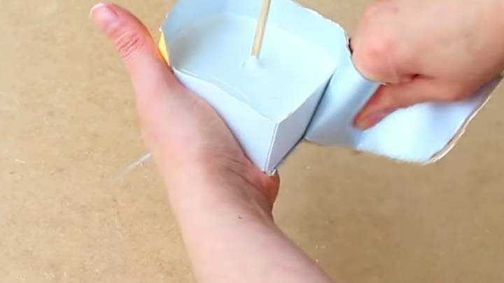 Коробку из-под молока или сока обрежьте, на дно налейте разведённый гипс. Установите поделку, дождитесь затвердевания гипса.