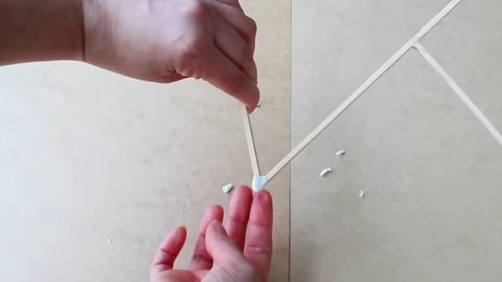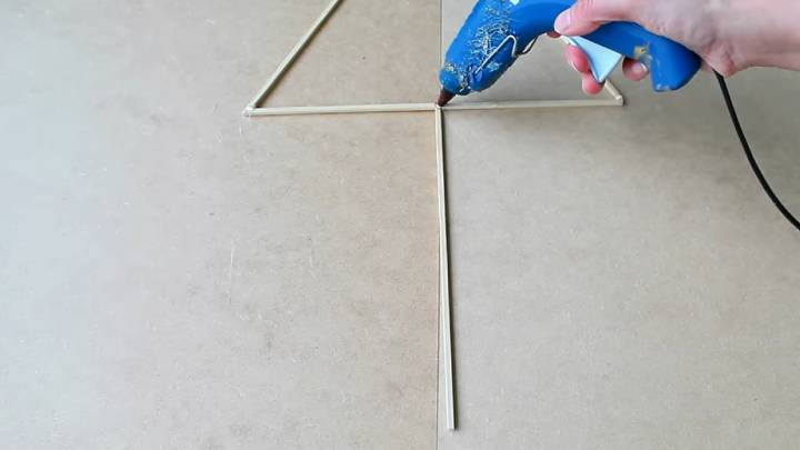 У шпажек удалите острый конец. Склейте три шпажки треугольником. Снизу приклейте ещё одну шпажку ровно по центру.