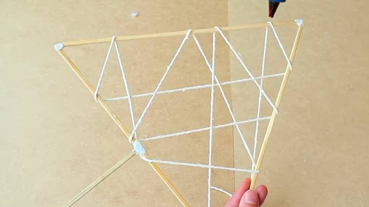 На следующий день оберните весь треугольник хаотично пряжей или верёвкой. Проклеивайте горячим клеем в некоторых местах, чтобы зафиксировать.