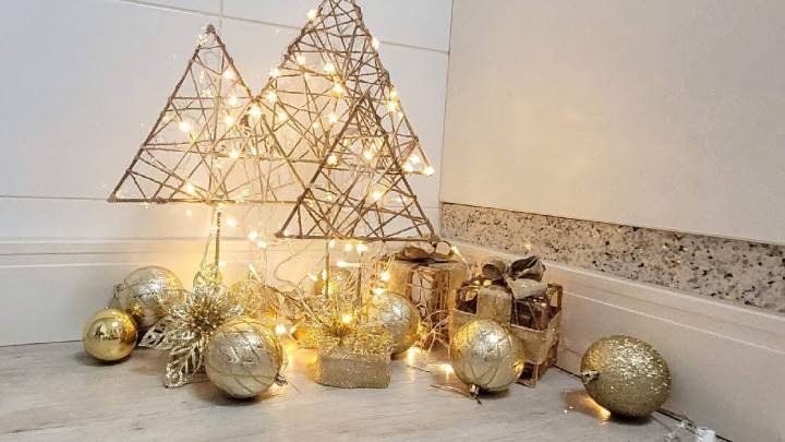 Сделайте несколько таких «ёлочек» разного размера и поставьте в угол, разложив рядом золотые шарики и подарки. Очень простая, но милая новогодняя композиция!