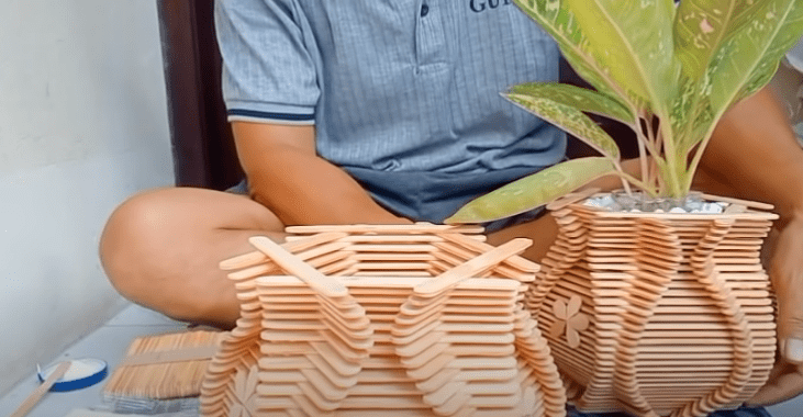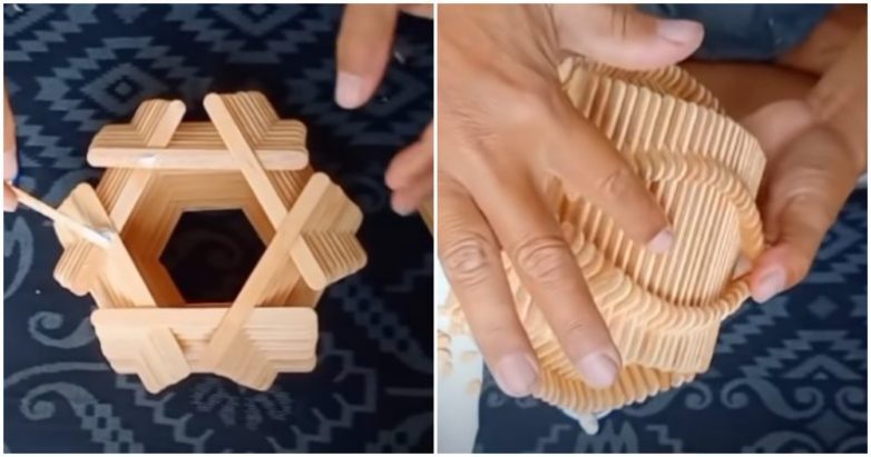 В качестве материала для создания такой вазы можно использовать деревянные палочки для мороженого, заранее заготовленные ветки или, например, палочки для суши. Главное — понять технику и принцип, а материал изготовления в дальнейшем можно и изменить.
