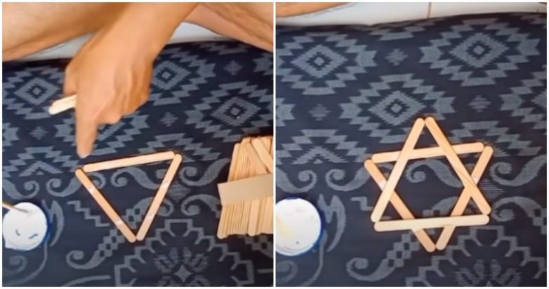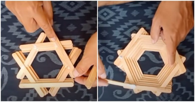 Начинать собирать вазу, конечно, необходимо с основания — его выкладываем в форме треугольника. Поверх первого треугольника выкладываем второй, но теперь в перевернутом виде. В местах соединения палочки фиксируем при помощи клея.