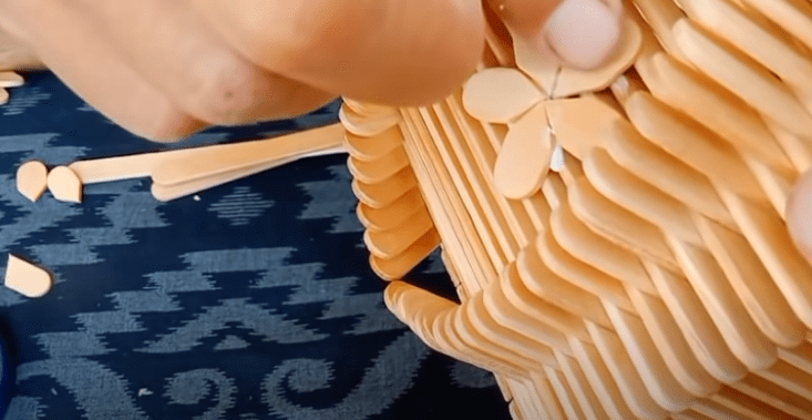 Далее наращиваем высоту будущей вазы, выкладывая и приклеивая палочки ряд за рядом, слегка отодвигая каждый последующий ряд от центра. Таким образом набираем желаемую высоту и ширину вазы.