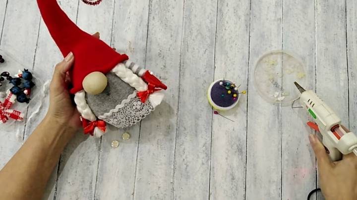 Приклейте, по желанию, декор гномику: кружево, бусины, снежинки, бантики из лент.