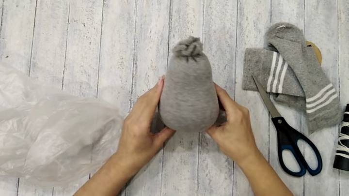 Отрежьте у серого носка верхнюю часть — носок. Набейте наполнителем, завяжите ниткой.
