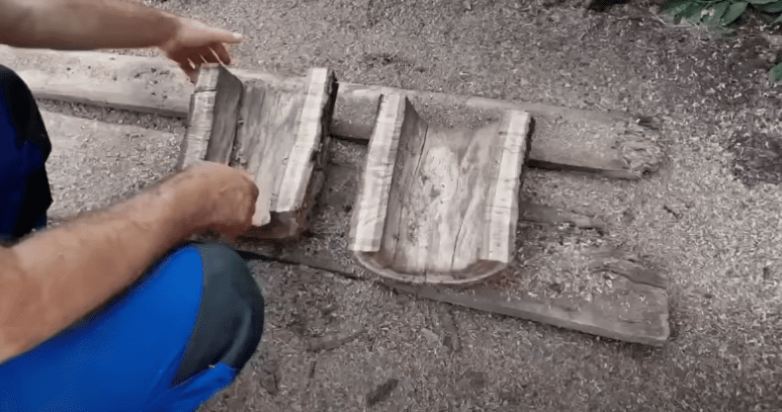 Для создания ножек будущей скамьи будем использовать пенек подходящего размера, в нашем случае он без сердцевины. Пенек разрезаем на 2 одинаковые части, которые затем зачищаем и зашлифовываем.